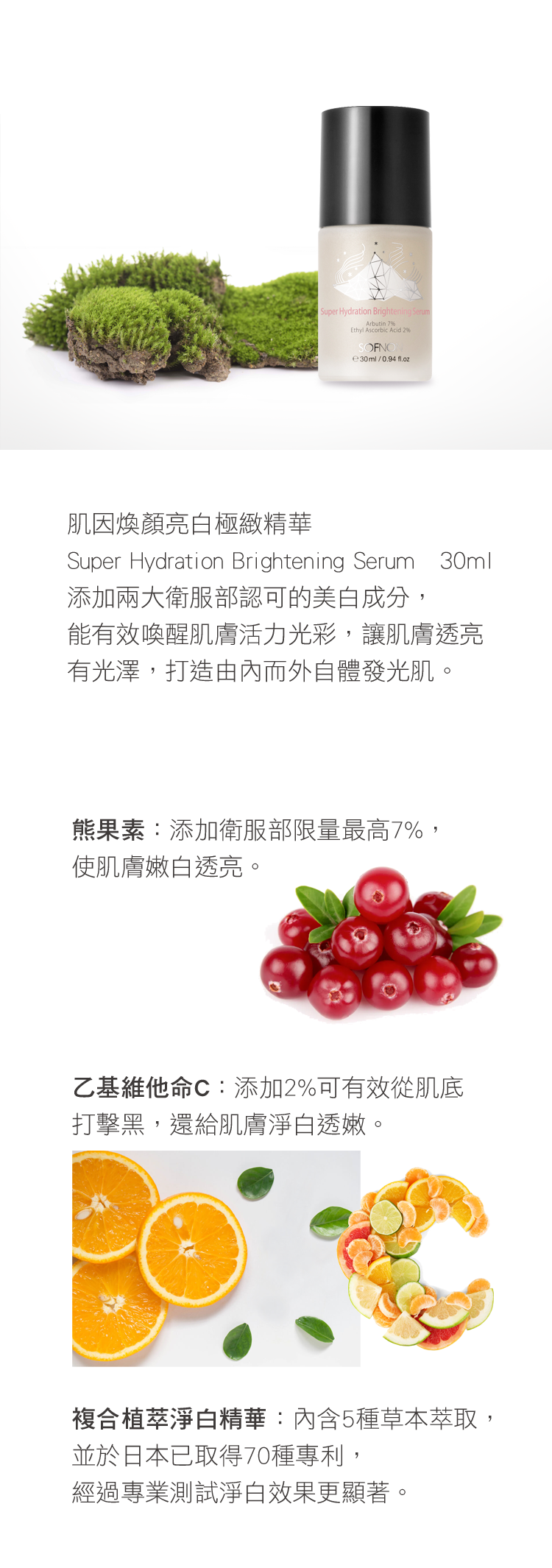 添加兩大衛福部認可的美白成份,能有效喚醒肌膚活力光彩,讓肌膚透亮有光澤,打造由內而外自體發光肌。