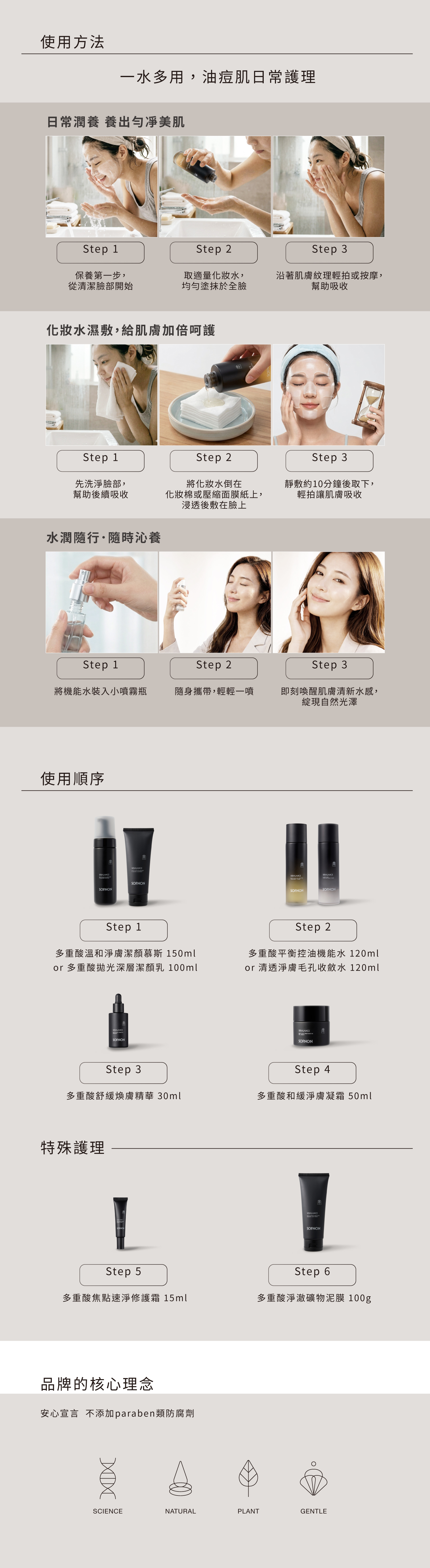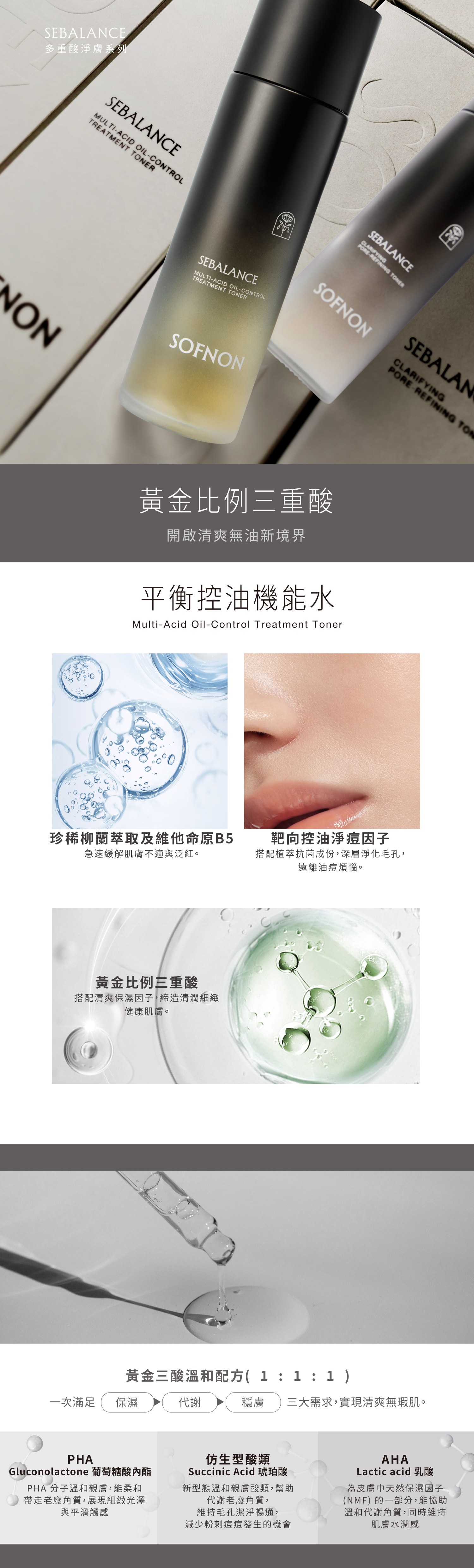 專為油性肌設計,黃金比例三重酸協同植萃抗菌成份,從根源緩解油痘煩惱。清爽的保濕因子搭配柳蘭萃取,急速安撫泛紅不適,締造清潤健康的細緻膚質。