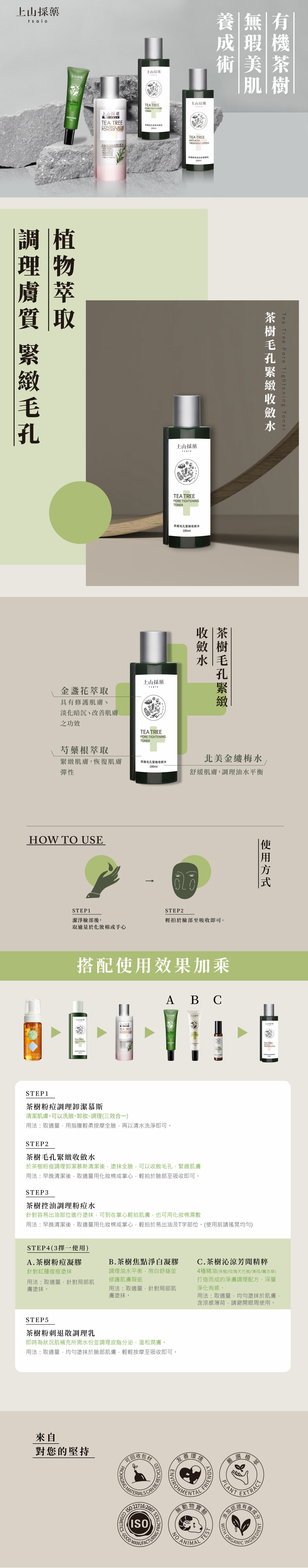 嚴選有機茶樹精油、IPMP抗菌成分,搭配北美金縷梅水、金盞花、芍藥根等植萃成分,清新收斂肌膚及毛孔,調理油水平衡,恢復健康好膚質。