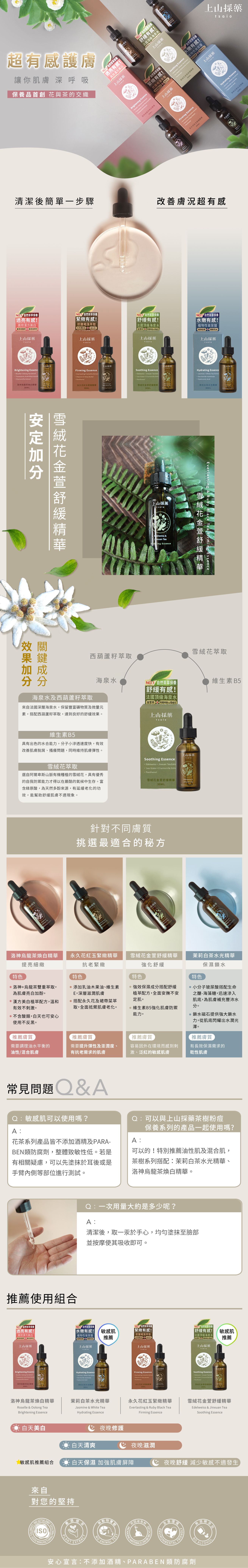 金萱茶萃搭配雪絨花及洋甘菊萃取,全面安撫不安定肌。