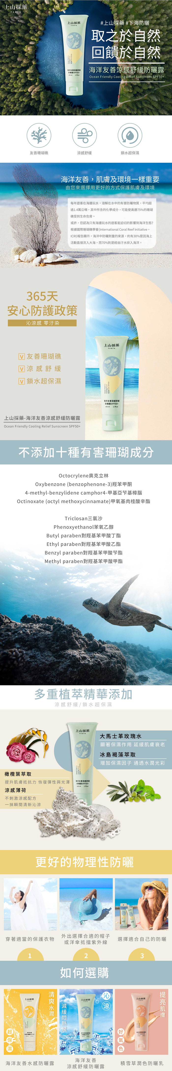 防禦紫外線照射的同時,能夠緩和肌膚的燥熱不適,且質地清爽舒適。添加紫花苜蓿萃取、大馬士革玫瑰水、冰島褐藻萃取,可預防肌膚乾燥、延緩老化,外抵禦內養肌,愛護肌膚也愛護海洋