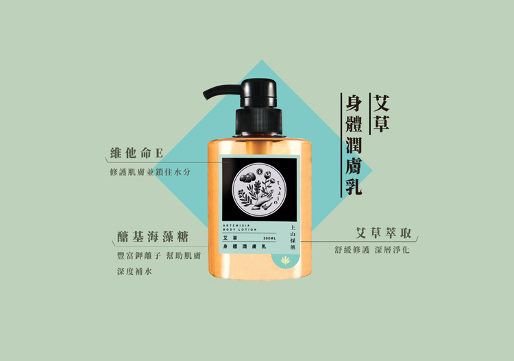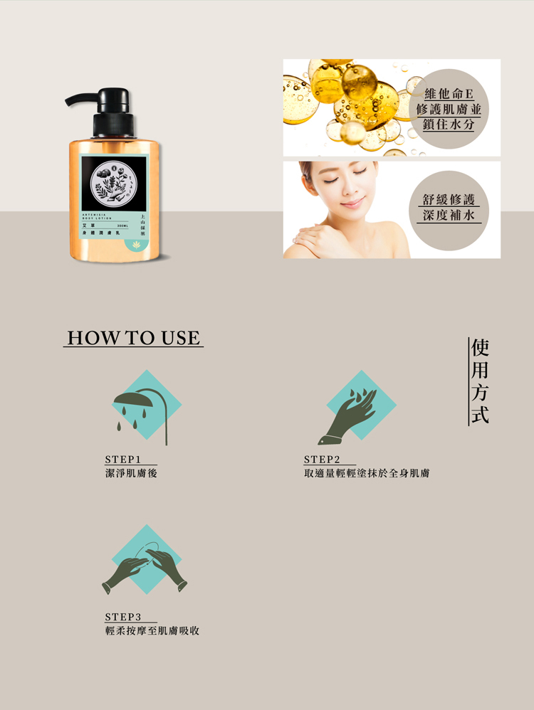 艾草萃取精華搭配維他命E,添加醣基海藻糖萃取精華,修護肌膚深層補水。