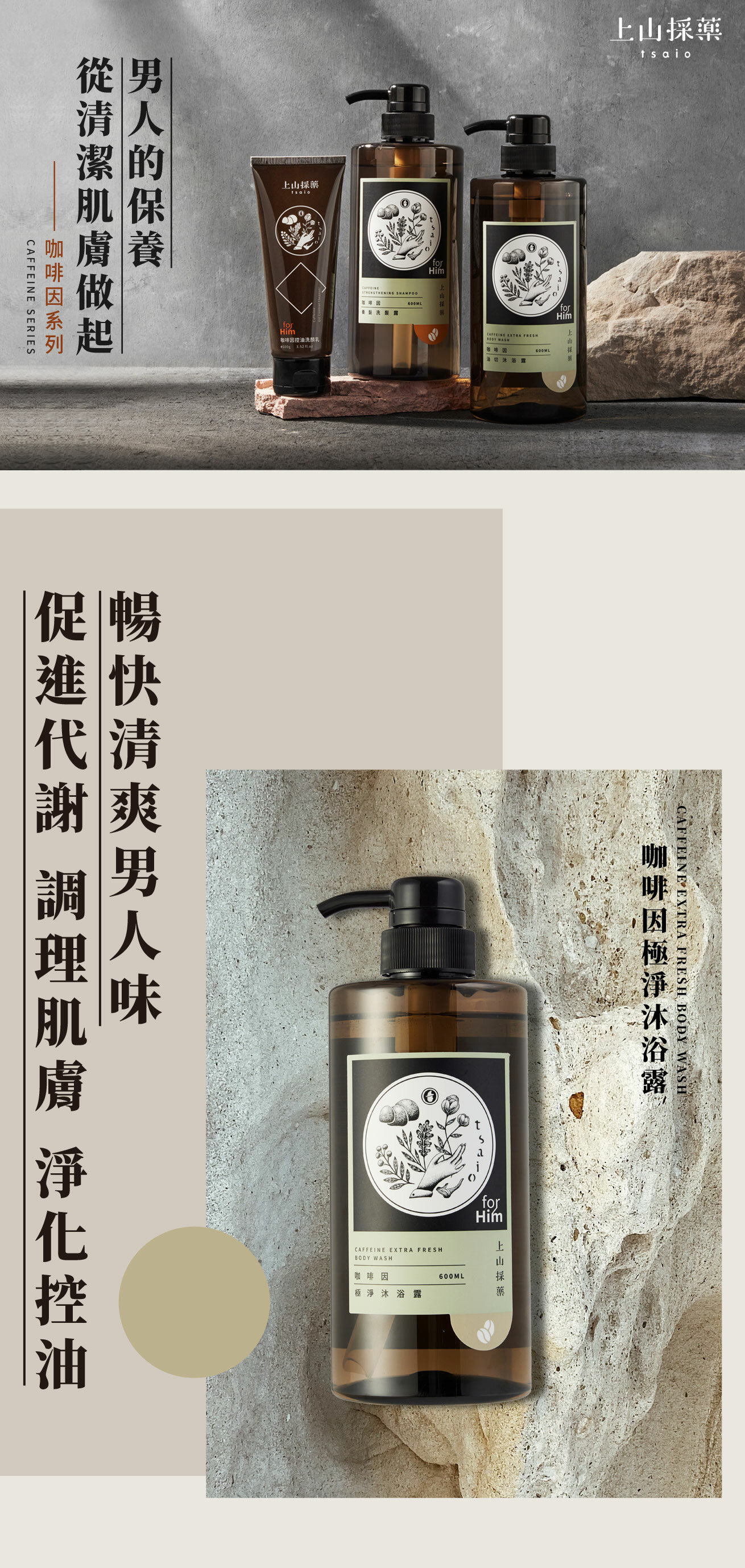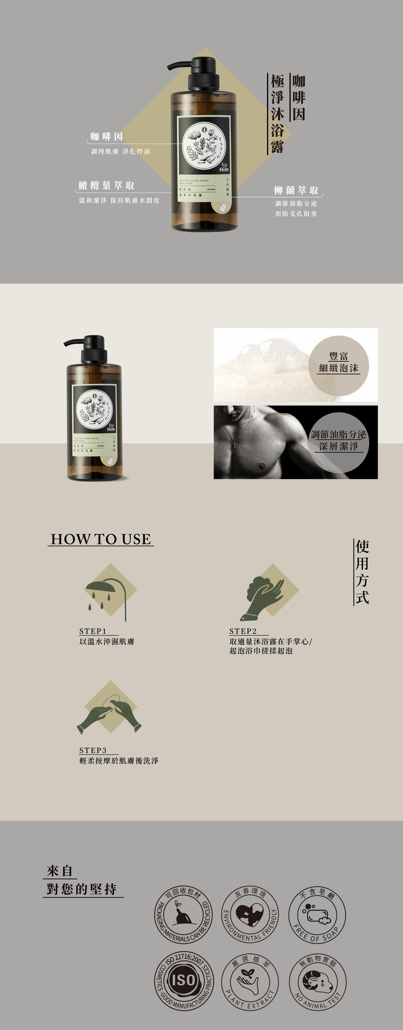 添加咖啡因、橄欖葉萃取,深層清潔全力洗去油脂髒汙、促進肌膚代謝,洗後肌膚乾爽潔淨。