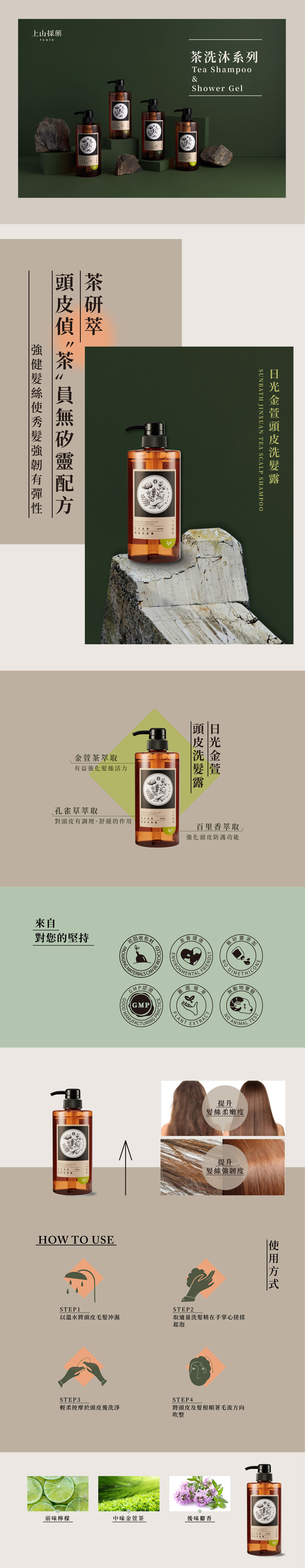 使用台灣特色金萱茶萃取強健髮絲使秀髮強韌有彈性,滋潤保濕秀護髮質。特別添加孔雀草萃取、百里香萃取,調理頭皮滋養髮根減少掉髮危機。