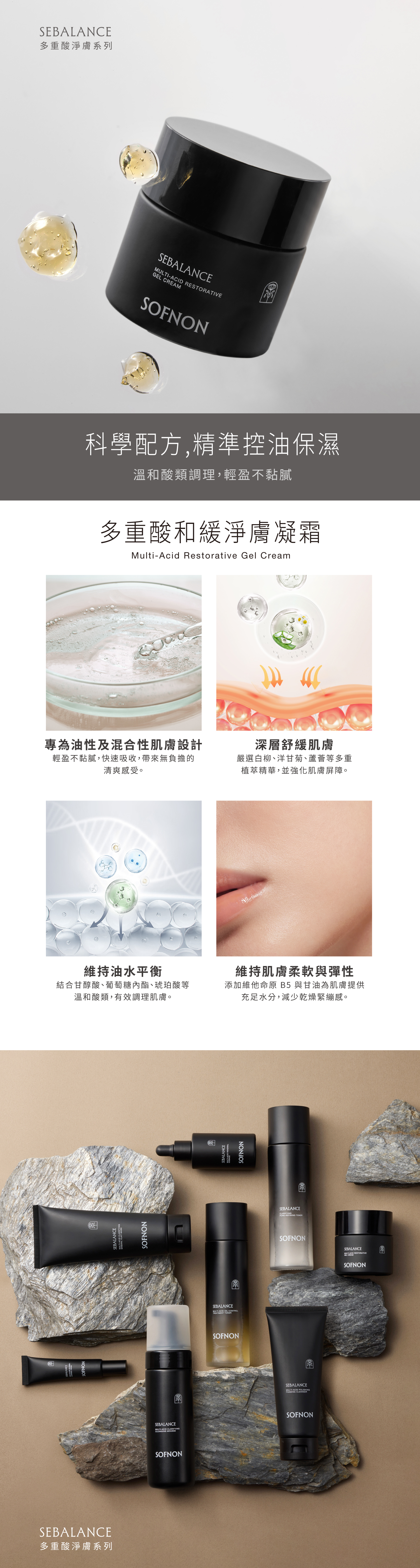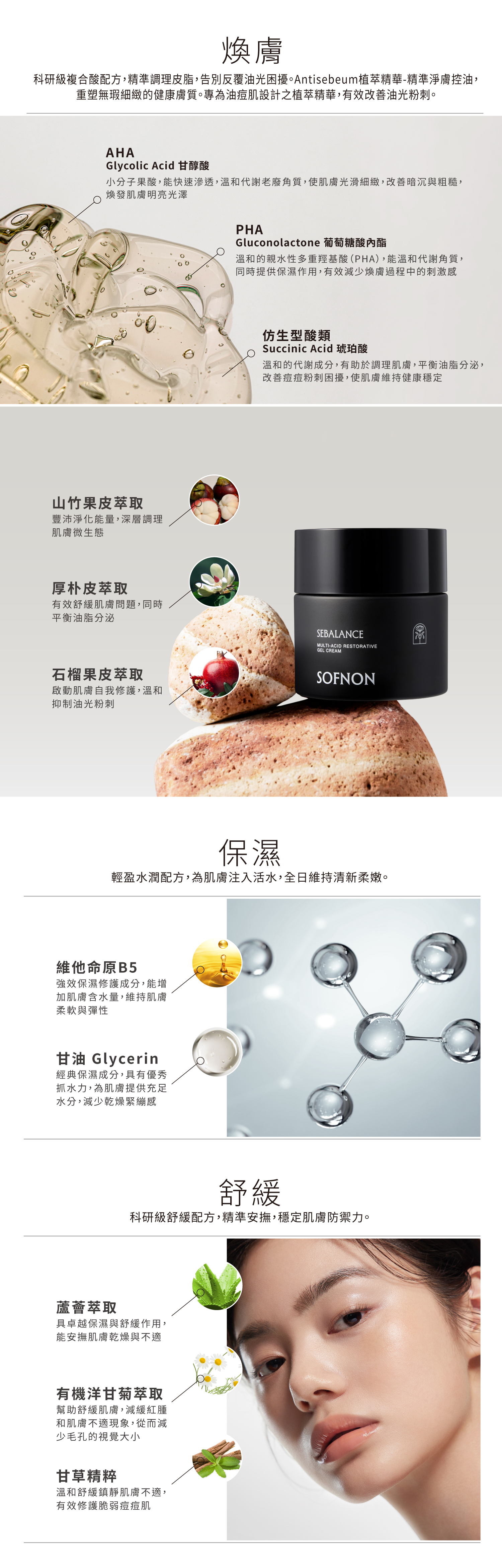 質地如水般清透可快速吸收,徹底打破面霜黏膩的印象。結合溫和酸類與洋甘菊、蘆薈萃取,在調理油水的同時深層舒緩,為肌膚築起一道清爽的保濕防禦屏障。