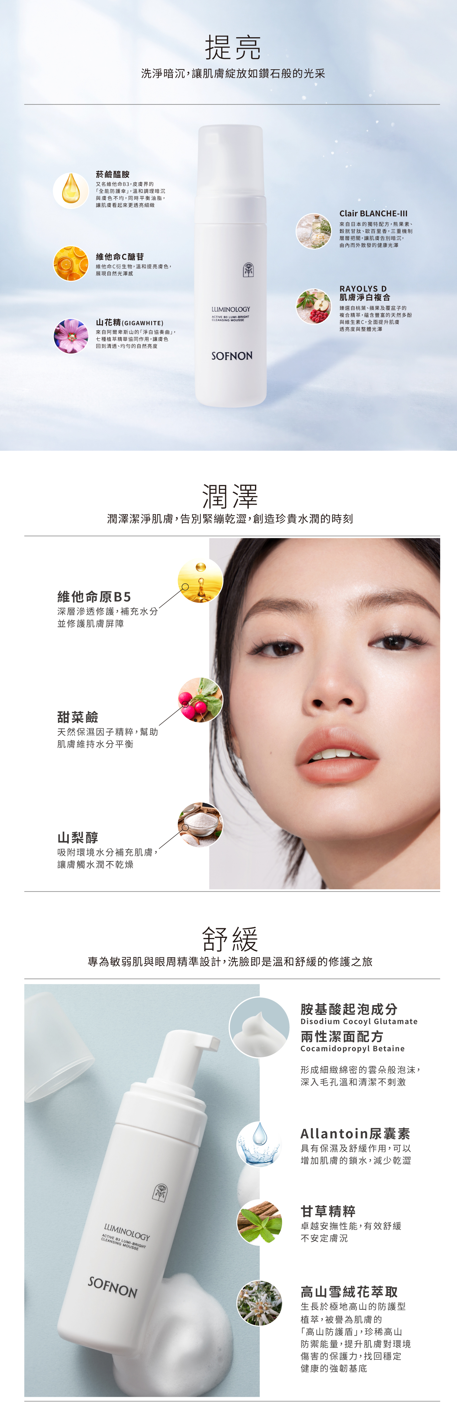 專為暗沉肌設計的溫和兩性配方,泡沫如雲朵般綿密,洗後水潤不緊繃。富含菸鹼醯胺與維他命C醣苷,洗臉同時亮白肌膚。獨家不熏眼配方,連細緻的眼周也能安心呵護。