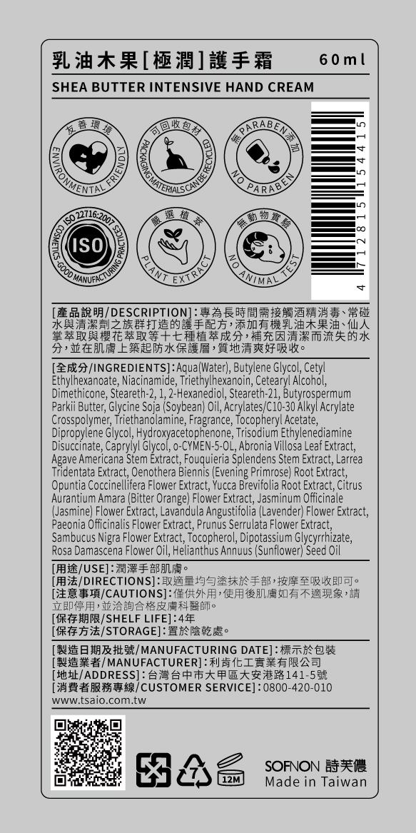 添加有機乳油木果油、仙人掌萃取與櫻花萃取等十七種植萃成分,補充因長期清潔手部而流失的水分。