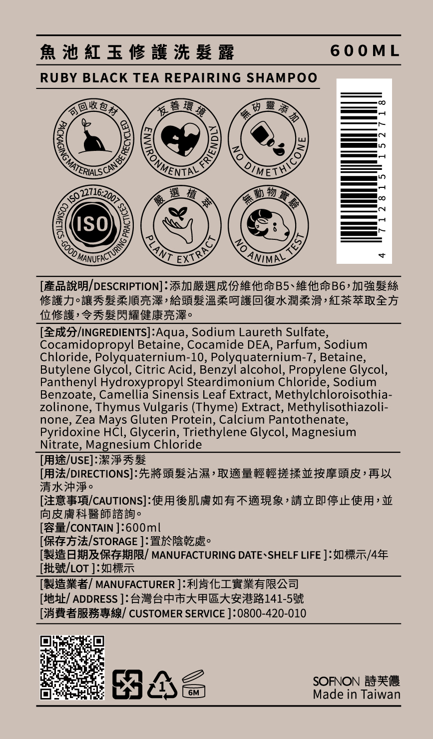 添加嚴選成份維他命B5、維他命B6,加強髮絲修護力。紅茶萃取全方位修護讓秀髮柔順亮澤,給頭髮溫柔呵護。